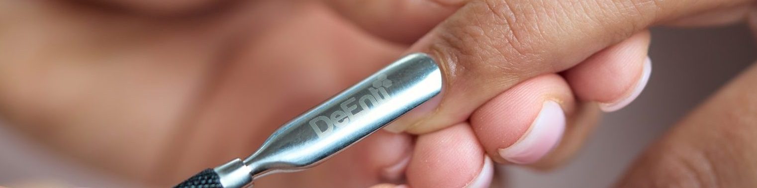 Gentle Cuticle Pushing: First, gently push back the cuticles. Pay close attention to the invisible layer of skin called the eponychium that grows on the nail plate. Every bit of this must be carefully removed, as any skin left behind will cause lifting.