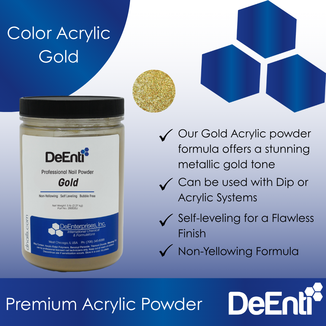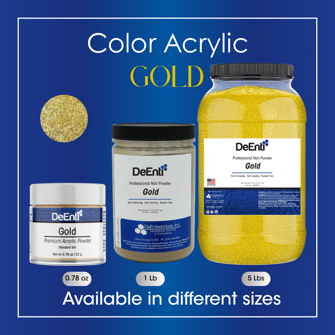 Sold by the pound (LBS). Gold Acrylic powder formula offers a stunning metallic gold tone. Its user-friendly mixture ensures a vibrant, eye-catching effect that will make your nails truly stand out!