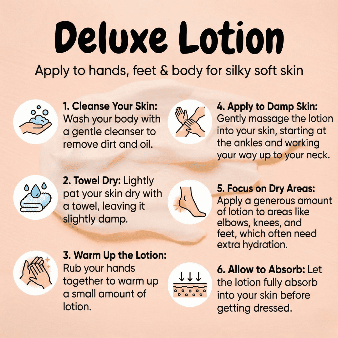InstructionsApply to hands, feet & body for silky soft skin 1. Cleanse Your Skin: Wash your body with a gentle cleanser to remove dirt and oil. |