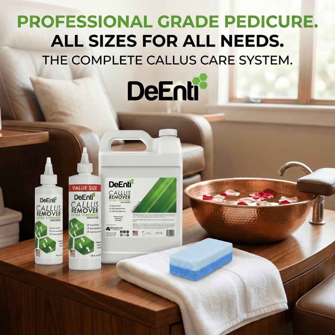 DeEnti Callus Remover Gel, a fast-acting, easy-to-apply, extra-strength formula that washes away clean. Trusted by salons worldwide, It is available in Unscented, Lemon, and Cool Mint.