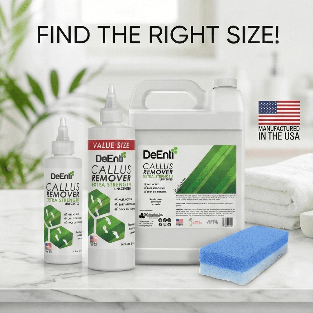 DeEnti Callus Remover is an Extra Strength Professional Grade formula. Breaks down Hard Calluses and Corns. Our Callus Remover is available in 3 fragrances – Unscented, Lemon or Cool Mint. Works fast and no drips like other brands. Remove cracked, dead skin within minutes.