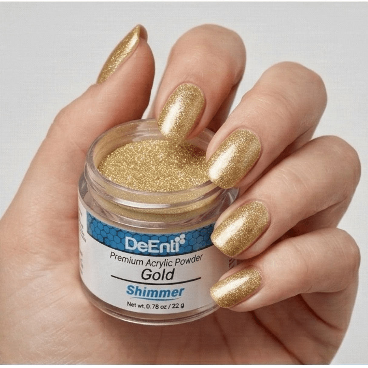 Our Gold Acrylic powder formula offers a metallic gold tone, and its simple mixture makes nails POP!
