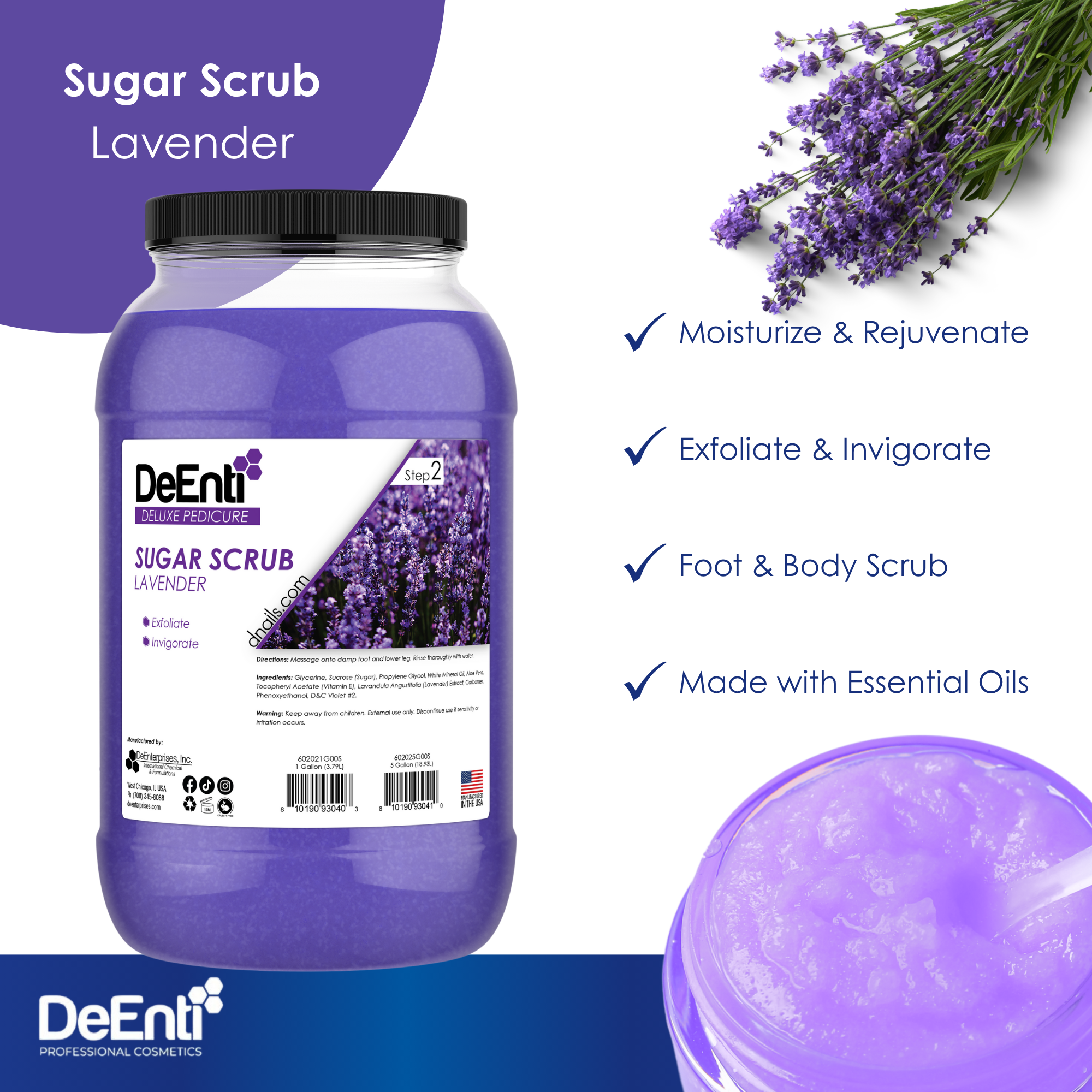 • 1-gallon jar of DeEnti Lavender Sugar Scrub, a calming exfoliating product for professional pedicures, shown next to fresh lavender sprigs. Lavender Sugar Scrub – 1 Gallon